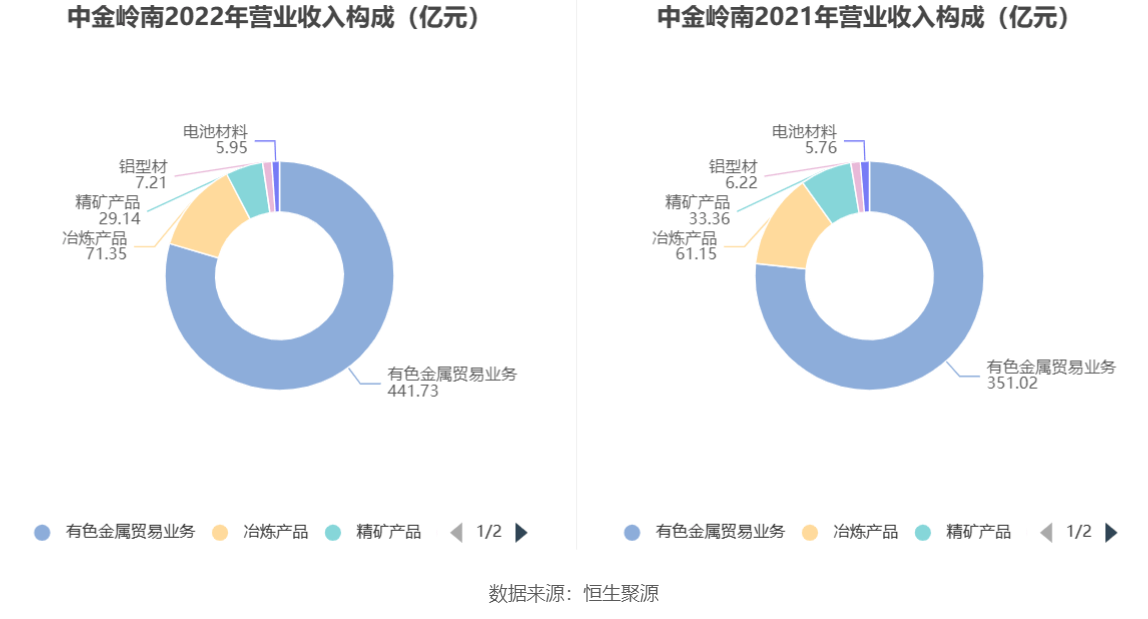 分产品来看,2022年度公司主营业务中,有色金属贸易业务收入441.73亿元,同比增长25.84%,占营业收入的79.68%;冶炼产品收入71.35亿元,同比增长16.68%,占营业收入的12.87%;精矿产品收入29.14亿元,同比下降12.65%,占营业收入的5.26%。