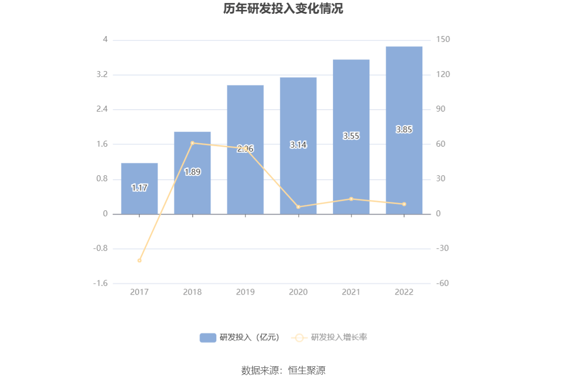 2022年全年,公司研发投入金额为3.85亿元,同比增长8.51%;研发投入占营业收入比例为0.70%,相比上年同期下降0.10个百分点。此外,公司全年研发投入资本化率为0。