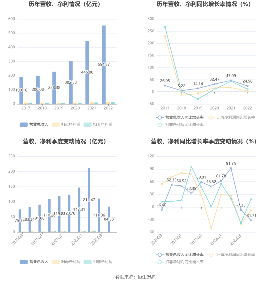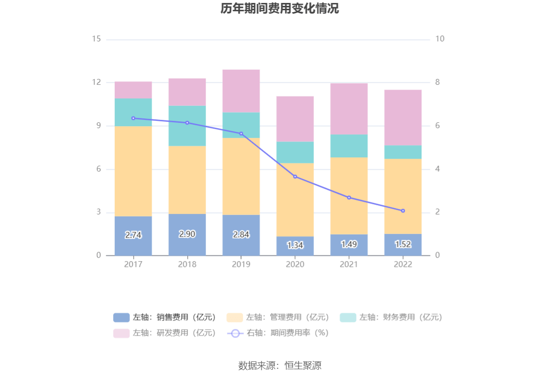 2022年全年,公司期间费用为11.52亿元,较上年减少4336.54万元;期间费用率为2.08%,较上年同期下降0.61个百分点。其中,销售费用同比增长2.37%,管理费用同比下降2.35%,研发费用同比增长8.51%,财务费用同比下降40.62%。