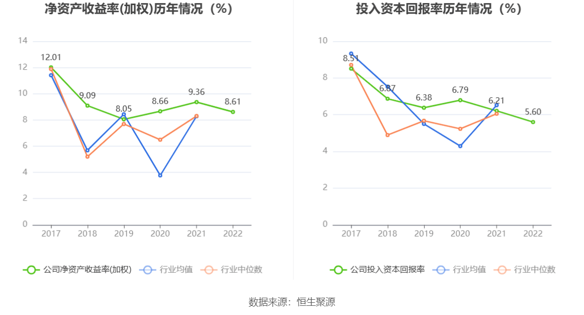 数据显示,2022年公司加权平均净资产收益率为8.61%,较上年同期下降0.75个百分点;公司2022年投入资本回报率为5.60%,较上年同期下降0.61个百分点。