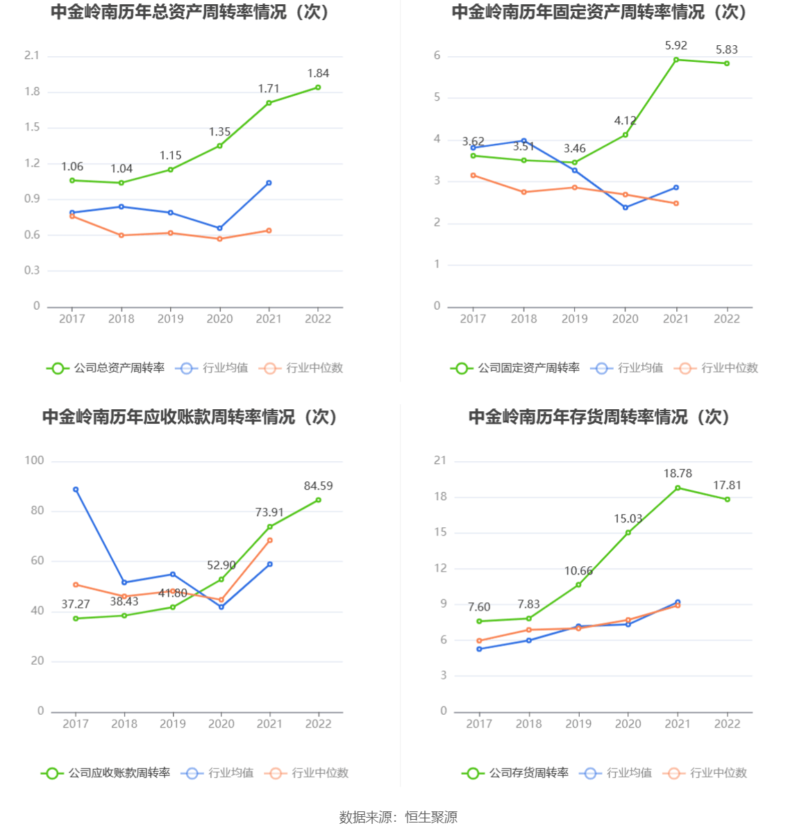 营运能力方面,2022年,公司总资产周转率为1.84次,上年同期为1.71次(2021年行业平均值为1.04次,公司位居同行业5/14);固定资产周转率为5.83次,上年同期为5.92次(2021年行业平均值为2.86次,公司位居同行业4/14);公司应收账款周转率、存货周转率分别为84.59次、17.81次。