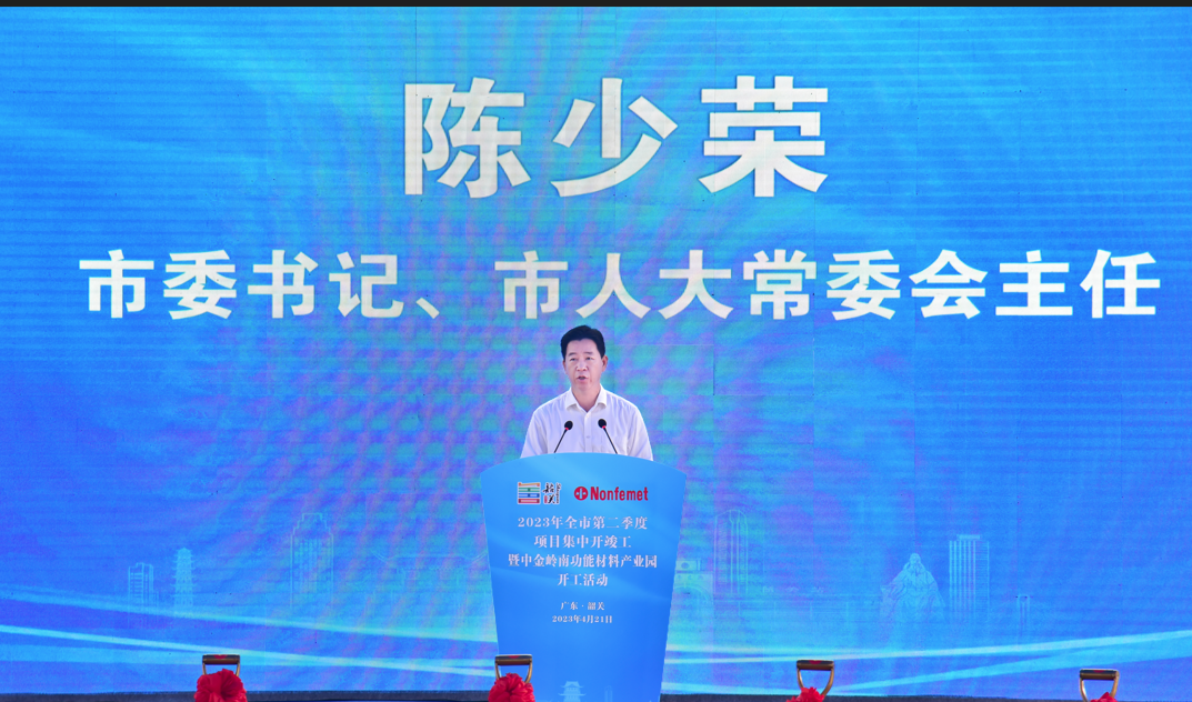 4月21日上午,韶关市2023年全市第二季度项目集中开竣工活动暨中金岭南功能材料产业园开工活动成功举行。韶关市委书记陈少荣宣布活动开工,市长陈志清出席活动并致辞。韶关市委副书记杨安队,市人大常委会党组副书记、副主任凌振伟,市委常委、常务副市长邹振宇,中金岭南党委书记、董事长王碧安,党委副书记、董事、总裁张木毅等出席活动。
