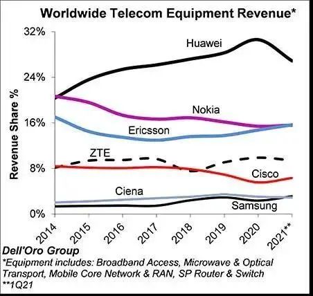 可以看出,除了华为业绩大幅下滑外,全球主要通信设备厂商利润都出现大幅增长,原因主要是2021年的全球5G建设提速与华为份额的挤出,而中兴运营商业务本身对海外依赖就没有那么大,加上海外国家对中兴设备的抵制并没有那么强烈,因此才让其起码是跟上了爱立信、诺基亚们的增长步伐。截至2021第一季度,中兴在全球通信设备市场份额稳中有升,实属难得。