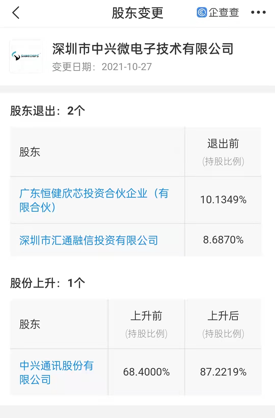 10月27日,根据企查查显示,深圳市中兴微电子技术有限公司发生股权变更,广东恒健欣芯投资合伙企业(有限合伙)、深圳市汇通融信投资有限公司退出。中兴通讯股份有限公司(以下简称“中兴通讯”)在深圳市中兴微电子技术有限公司的股份比例从68.4%增加到87.22%。