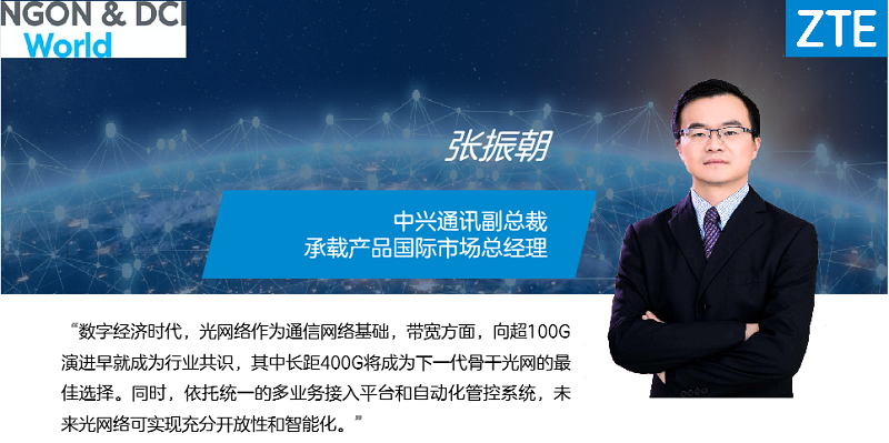 ICC 11月17日,在第23届下一代光网络&数据中心互联论坛(NGON&DCI World)光网络主论坛上,中兴通讯副总裁、承载产品国际市场总经理张振朝发表主题为《未来光网络的三大超级引擎——超100G、开放、智能》的演讲,他表示:“数字经济时代,光网络作为通信网络基础,带宽方面,向超100G演进早就成为行业共识,其中长距400G将成为下一代骨干光网的最佳选择。同时,依托统一的多业务接入平台和自动化管控系统,未来光网络可实现充分开放性和智能化。”