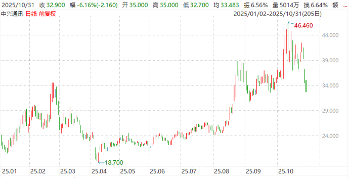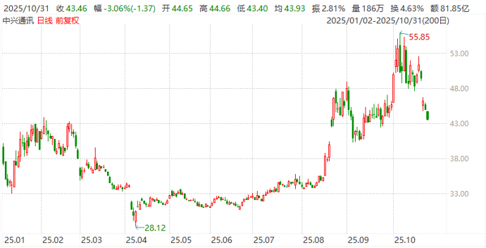 截至10月31日收盘,中兴通讯A股报43.46元/股,跌3.06%,总市值2079亿元。H股报32.90港元/股,跌6.16%,总市值1574亿港元。