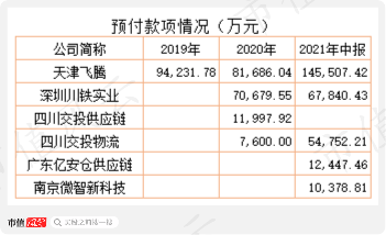 2021年中报披露,预付款项第一位的是参股子公司天津飞腾,看情况应该是上市公司主动帮扶;而预付款第二位是深圳川铁投广润实业发展有限公司(以下简称“深圳川铁实业”),工商登记信息显示,其成立于2019年4月23日,系四川省政府全资孙公司,与预付款项第三位的四川交投物流为关联方。