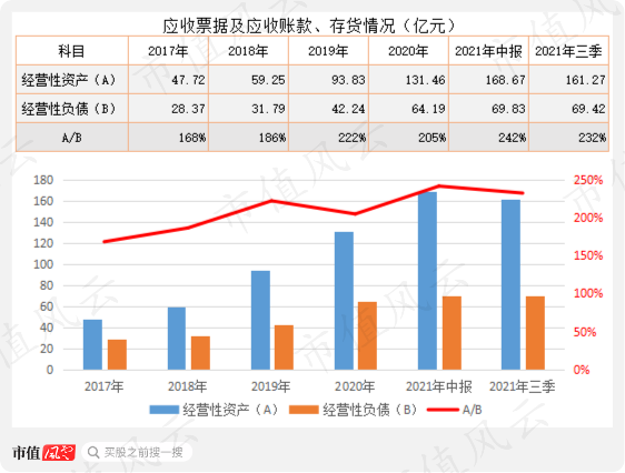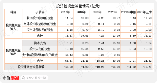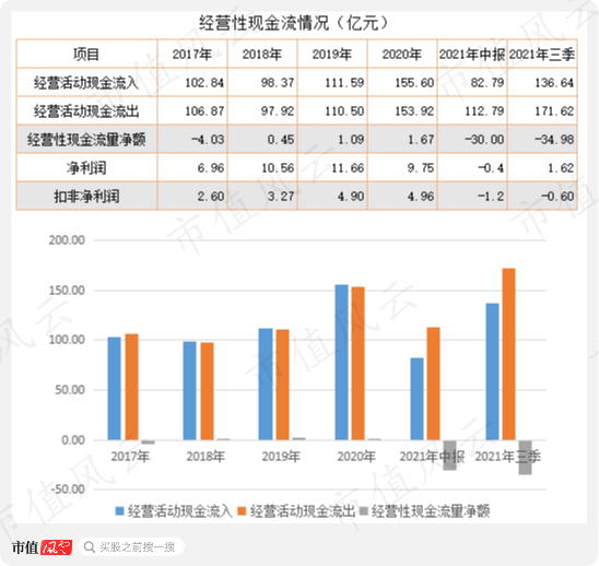 巨额资金被占用,最终反映在经营性现金流上就是净流出,截止2021年三季末净流出累计达35亿元。