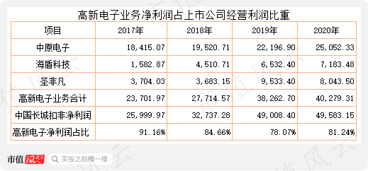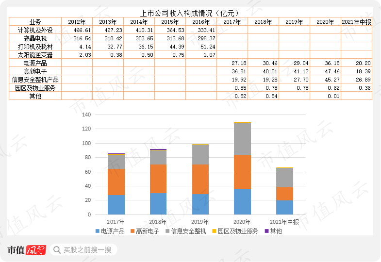 上文提到2017年重组完成后,上市公司的业务发生了彻底改变,主营业务调整为高新电子、信息安全整机、电源产品等。营业收入2017年至2020年整体保持增长,其中,信息安全整机增长较快,高新电子业务在2017至2019年相对稳定。