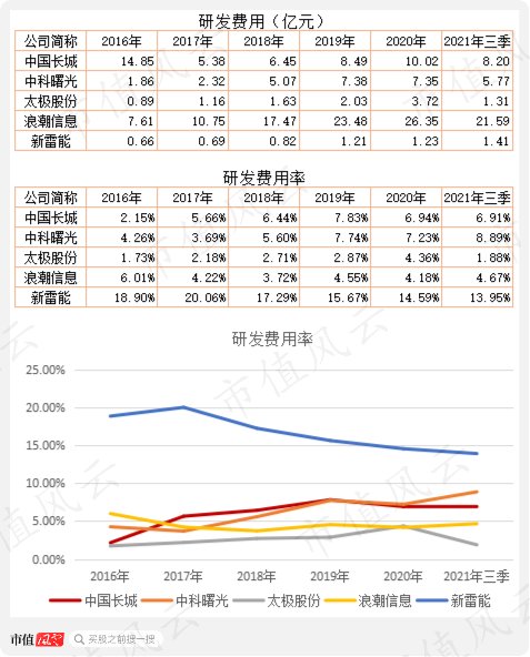 2017年重组完成后,上市公司的研发投入增长明显,从2017年的5.4亿元增至2020年10亿元,研发费用率接近7%;2019年以来,中国长城与中科曙光研发费用率比较接近,并且高于太极股份和浪潮信息。