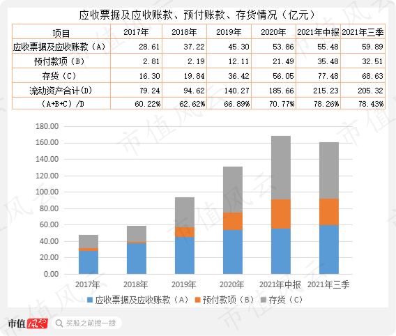 上市公司的流动资产中应收票据及应收账款、预付款项、存货等3项持续增长,2021年三季度末合计达161亿元,占流动资产近80%。