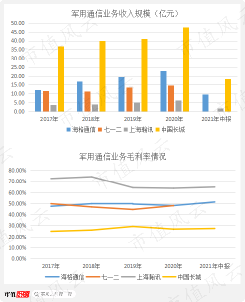中国长城在4家公司中,军用通信业务收入规模最高,但是,毛利率最低;海格通信的收入规模高于七一二,但二者的毛利率比较接近;上海瀚讯的收入规模最小,但毛利率最高。