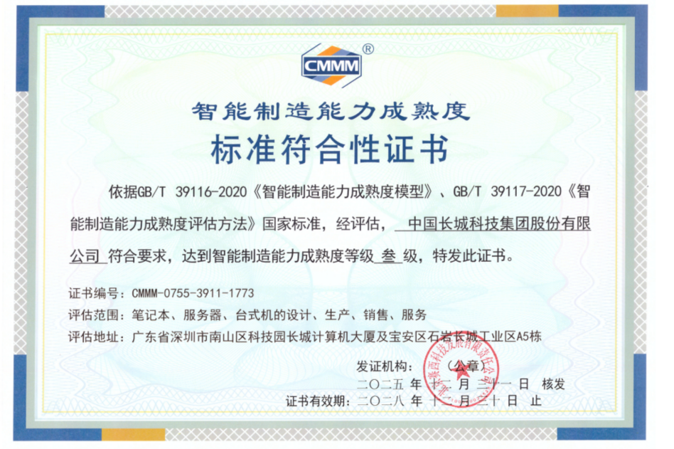 近日,中国长城通过国家智能制造能力成熟度三级评估认证,标志着公司在数字化转型、智能化与绿色化制造过程中取得阶段性成果。