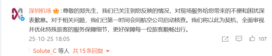 此后,深圳机场在郑智化微博下留言致歉,表示已关注到他反映的情况,并对现场服务给郑智化带来的不便和困扰深表歉意。对于相关问题,深圳机场方面已第一时间会同航空公司启动核查。