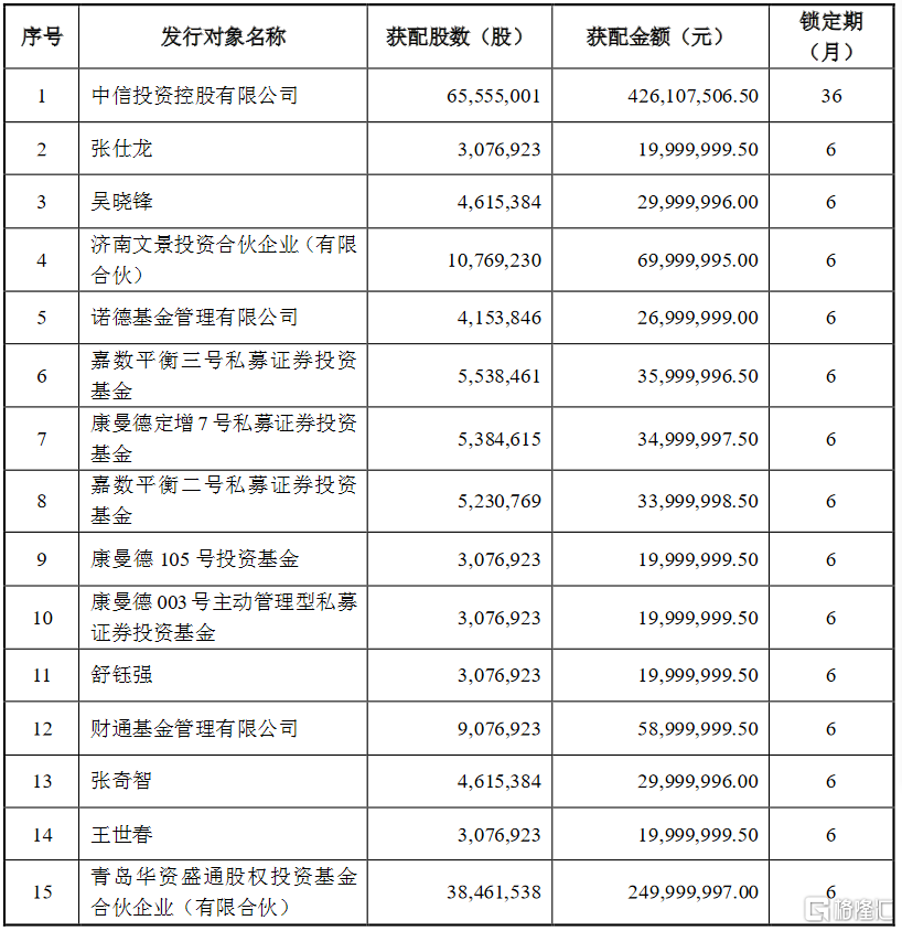 中信海直(000099.SZ)披露非公开发行股票发行情况报告书暨上市公告书,确定此次发行价格为6.5元/股,发行股数169,699,717股,募集资金总额约11.03亿元。此次发行对象最终确定为16 位,此次发行配售情况如下: