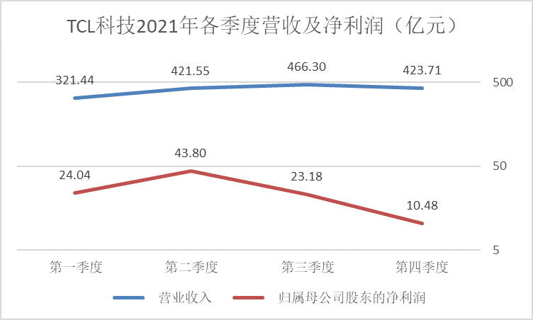 结合2021年三季报数据,以TCL科技业绩预告数据的中值计算,第四季度公司实现营收约423.71亿元,实现净利润10.48亿元。在营收环比未出现较大变化的前提下,公司连续两个季度净利润接近腰斩。