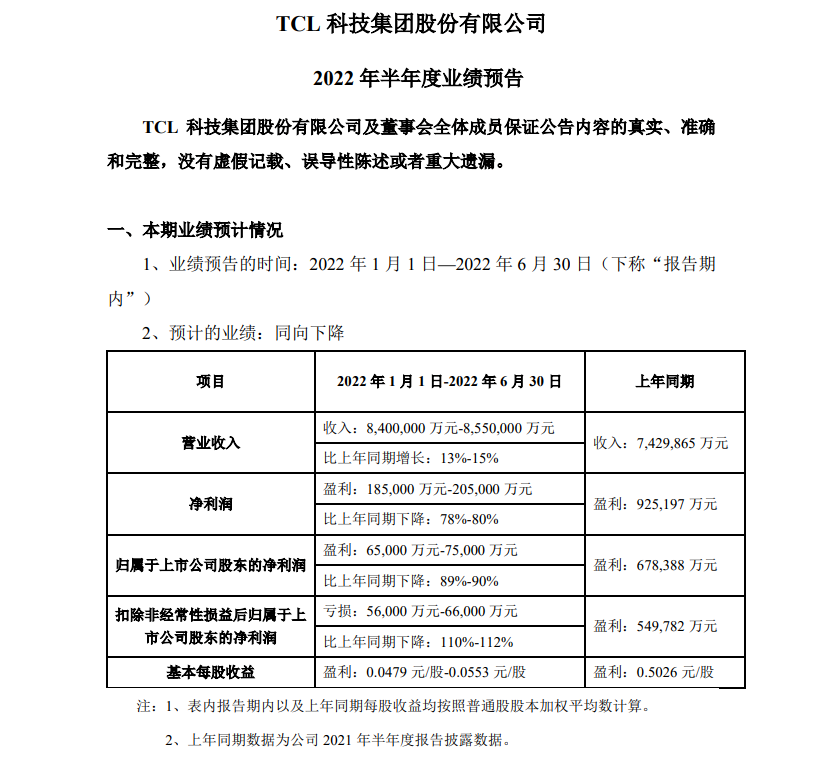 7月14日晚上,TCL科技发布业绩预告称,今年上半年公司实现营业收入840亿元-855亿元,同比增长13%-15%,归属上市公司股东净利润6.5-7.5亿元,同比下降89%-90%。