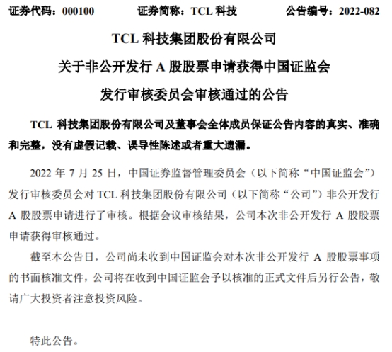 TCL科技表示,截至公告日,公司尚未收到中国证监会对本次非公开发行A股股票事项的书面核准文件,公司将在收到证监会予以核准的正式文件后另行公告。
