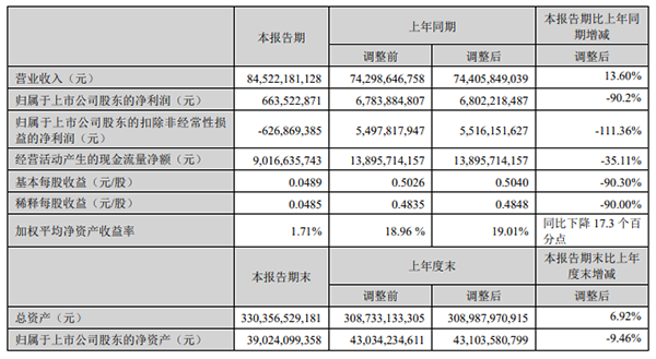 28日,TCL科技公布2022年半年报。报告期内,公司营收845.22亿元,同比增长13.6%;净利润19.3亿元,同比下降 79.3%;归母净利润6.64亿元,同比下降90.2%。