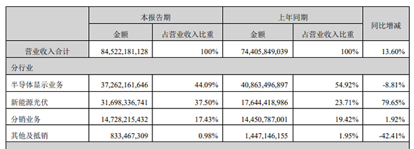 据悉,半导体显示业务占TCL科技营业收入比重最高,其次为新能源光伏、分销业务。报告期内,半导体显示业务实现营业收入372.6亿元,同比下降 8.81%,亏损22.7亿元。不过在