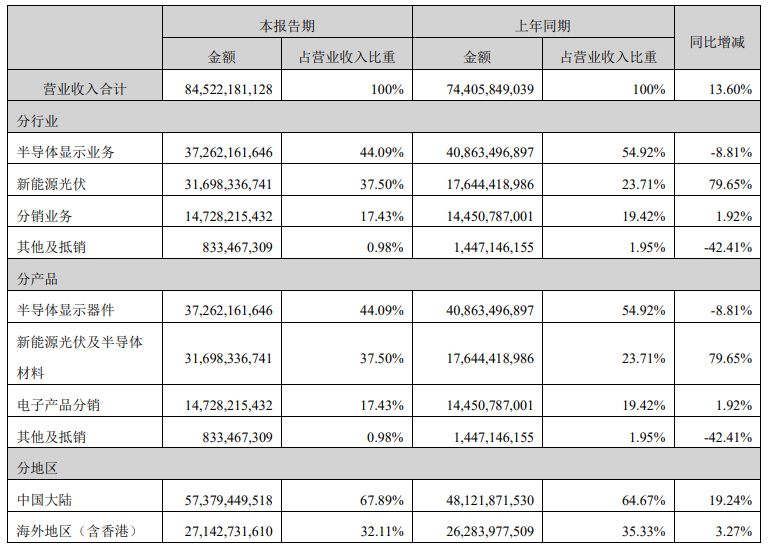 据报告显示,TCL的业务框架分为半导体显示、新能源光伏及半导体材料、产业金融与其他四大部分。其中,2022上半年,半导体显示业务实现营收372.6亿元,新能源光伏及半导体材料实现营收316.9亿元,分销业务实现营收147.2亿元,其他业务实现营收8.33亿元。