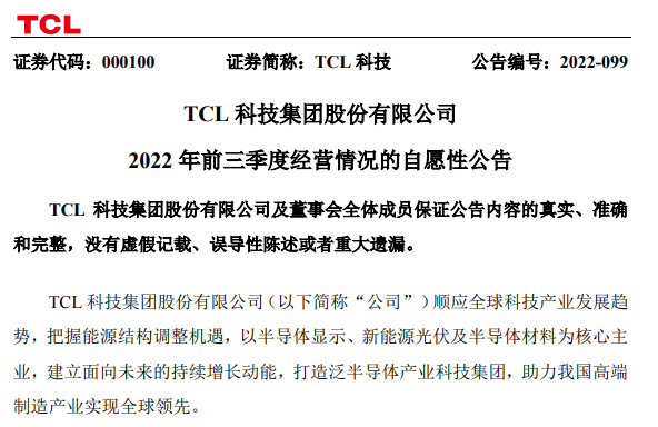 公告显示,TCL华星前三季度预计实现销售面积3331万平方米,同比增长17%,车载、商用显示等非TV类业务收入占比持续提升。2022年前三季度,TCL中环预计实现归属于其股东净利润49.3亿元-50.7亿元,同比增长78.53%-83.60%。