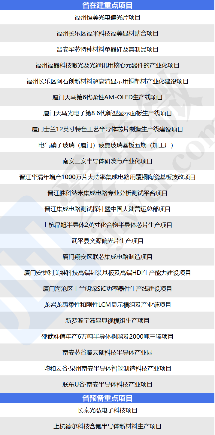 省在建重点项目中,包括福州恒美光电偏光片项目、厦门天马第6代柔性AM-OLED生产线项目、厦门天马光电子第8.6代新型显示面板生产线项目、厦门士兰12英寸特色工艺半导体芯片制造生产线建设项目、电气硝子玻璃(厦门)液晶玻璃基板五期(加工厂)、南安三安半导体研发与产业化项目、晋江华清年增产1000万片大功率集成电路用覆铜陶瓷基板技改项目、厦门海沧区士兰明镓SiC功率器件生产线建设项目等。
