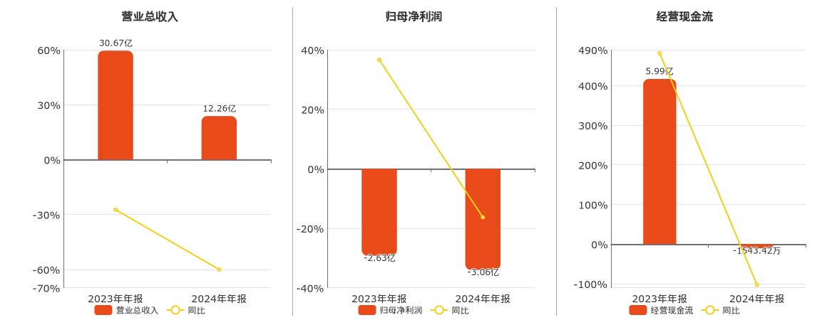 公司营业总收入为12.26亿元,较去年同报告期营业总收入减少18.41亿元,同比较去年同期下降60.02%。归母净利润为-3.06亿元,较去年同报告期归母净利润减少4288.52万元。经营活动现金净流入为-1543.42万元,较去年同报告期经营活动现金净流入减少6.15亿元,同比较去年同期下降102.57%。