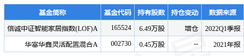 根据2022Q1季报基金重仓股数据,重仓该股的基金共1家,其中持有数量最多的基金为信诚中证智能家居指数(LOF)A。信诚中证智能家居指数(LOF)A目前规模为0.37亿元,最新净值0.6969(4月22日),较上一日下跌1.18%,近一年下跌20.72%。该基金现任基金经理为黄稚。黄稚在任的公募基金包括:中信保诚中证500指数(LOF)A,管理时间为2018年7月25日至今,期间收益率为40.87%;信诚中证基建工程指数(LOF)A,管理时间为2018年7月25日至今,期间收益率为-13.28%;信诚中证800医药指数(LOF)A,管理时间为2019年9月4日至今,期间收益率为25.64%;信诚中证800有色指数(LOF)A,管理时间为2019年9月4日至今,期间收益率为81.78%。