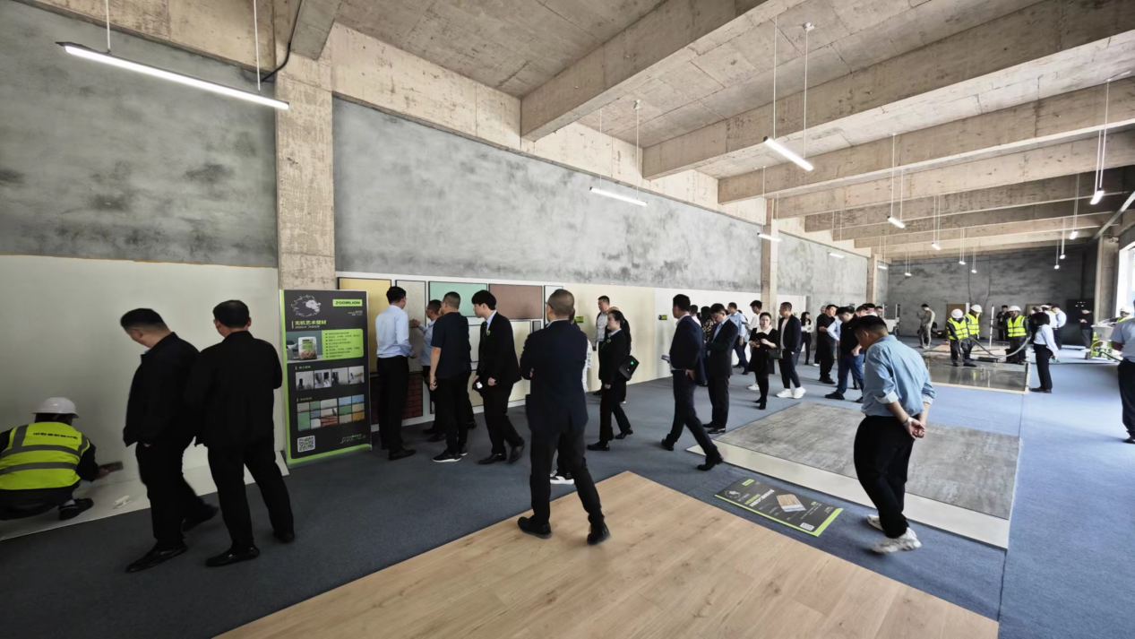 在参观过程中,中联重科集团副总裁、中联重科新材料董事长陈培亮以及中联重科相关工作人员向参观者们进行细致产品讲解,包括“自流精找平、地暖高导热、薄贴不空鼓”的高流动性地坪砂浆;德国技术,环保品质,纯无机、无甲醛、零VOC”的无机艺术壁材……除此之外,中联新材还借由现场作业生动地展示了新材料、新装备、新技术。