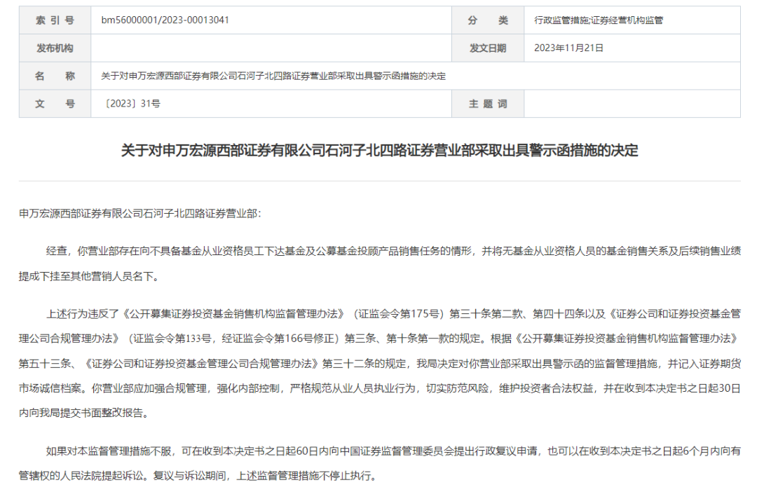 沉寂年余之后,新疆证监局再度向券商出手,点名申万宏源西部证券有限公司(简称:申万宏源西部)涉嫌“摊派”销售业务。