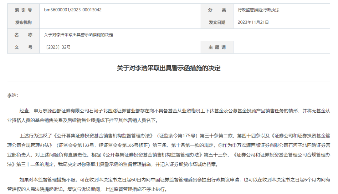 与此同时,身为营业部总经理的李浩,因对违规行为负有直接责任,也被监管警示并记入诚信档案。