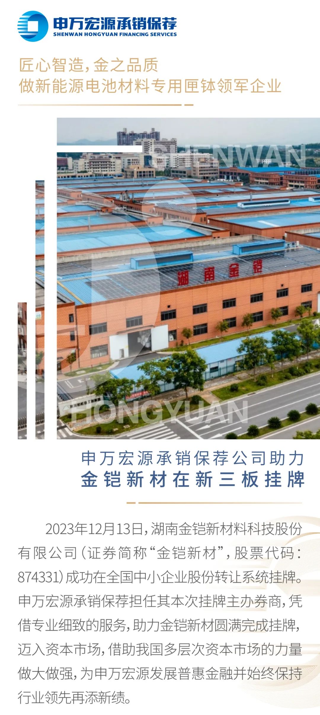 金铠新材成功挂牌全国中小企业股份转让系统,是申万宏源承销保荐坚定战略布局、坚持服务中小型创新创业企业的又一硕果,是落实证监会、交易所及全国股转公司关于构建多层次资本市场、实现多层次市场间的互联互通机制的完美实践。未来,申万宏源承销保荐继续坚持将服务中小企业生命周期发展作为重要使命,为各个发展生命周期的创新创业企业提供全产业链专业服务,坚守金融服务实体经济根本宗旨,为助力广大实体企业高质量发展贡献央企力量。