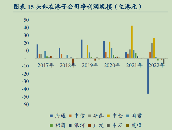 据华创证券研报,外在经营环境不佳导致在港中资券商经纪、投行、自营等业务出现了显著滑坡,特别是自营投资方面,市场行情下跌叠加自身资产配置理念和风险控制等内部因素,导致业绩减少甚至重大亏损。2022年5家中资券商在港上市子公司共产生亏损78.8亿港元,而2018年-2021年间五家券商共实现净利润80.1亿港元,一年的亏损几乎抵消了前四年的经营成果。