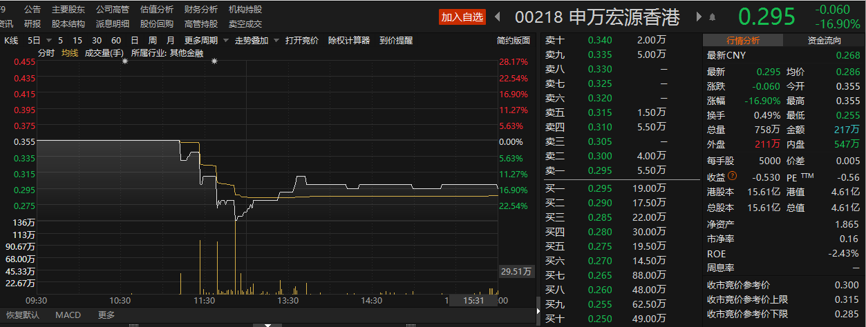 事实上,在今日之前的较长时间内,申万宏源香港一直处于缩量阴跌状态,今日尽管明显放量,但全天的成交额也仅为218万港元。在港股市场,一些流动性差的仙股出现类似的股价大幅波动也并不罕见。
