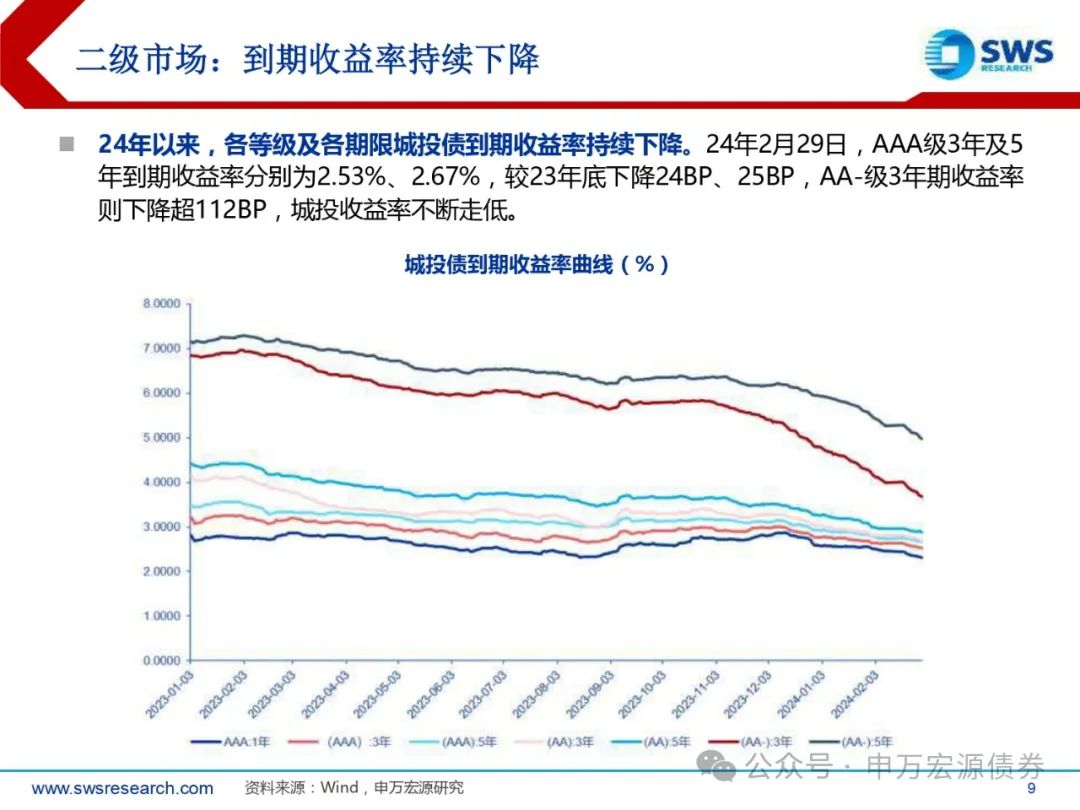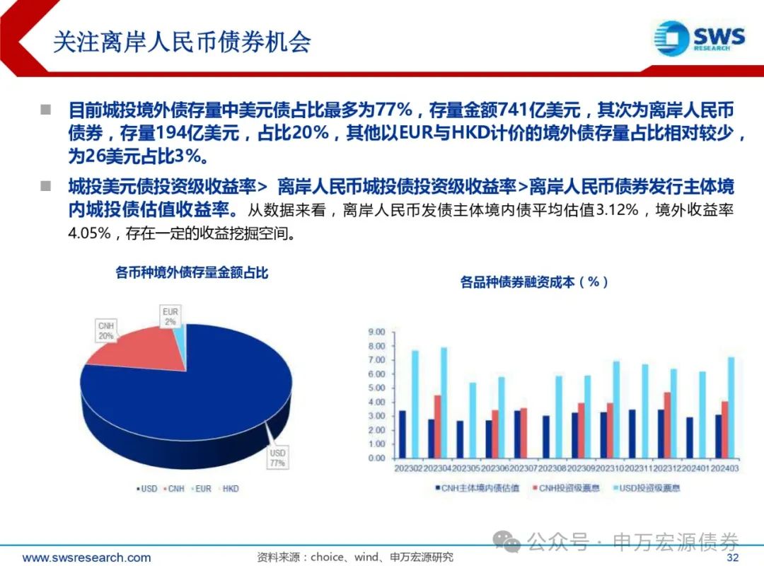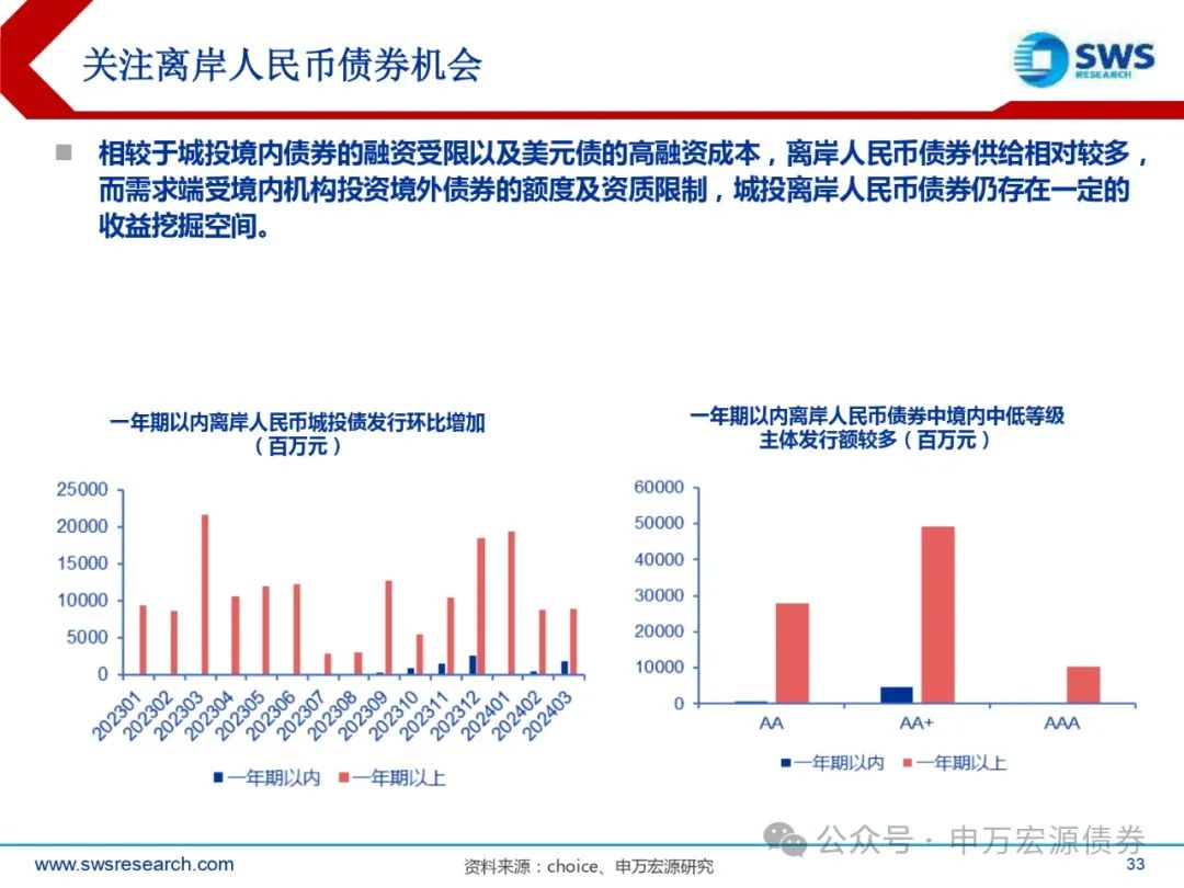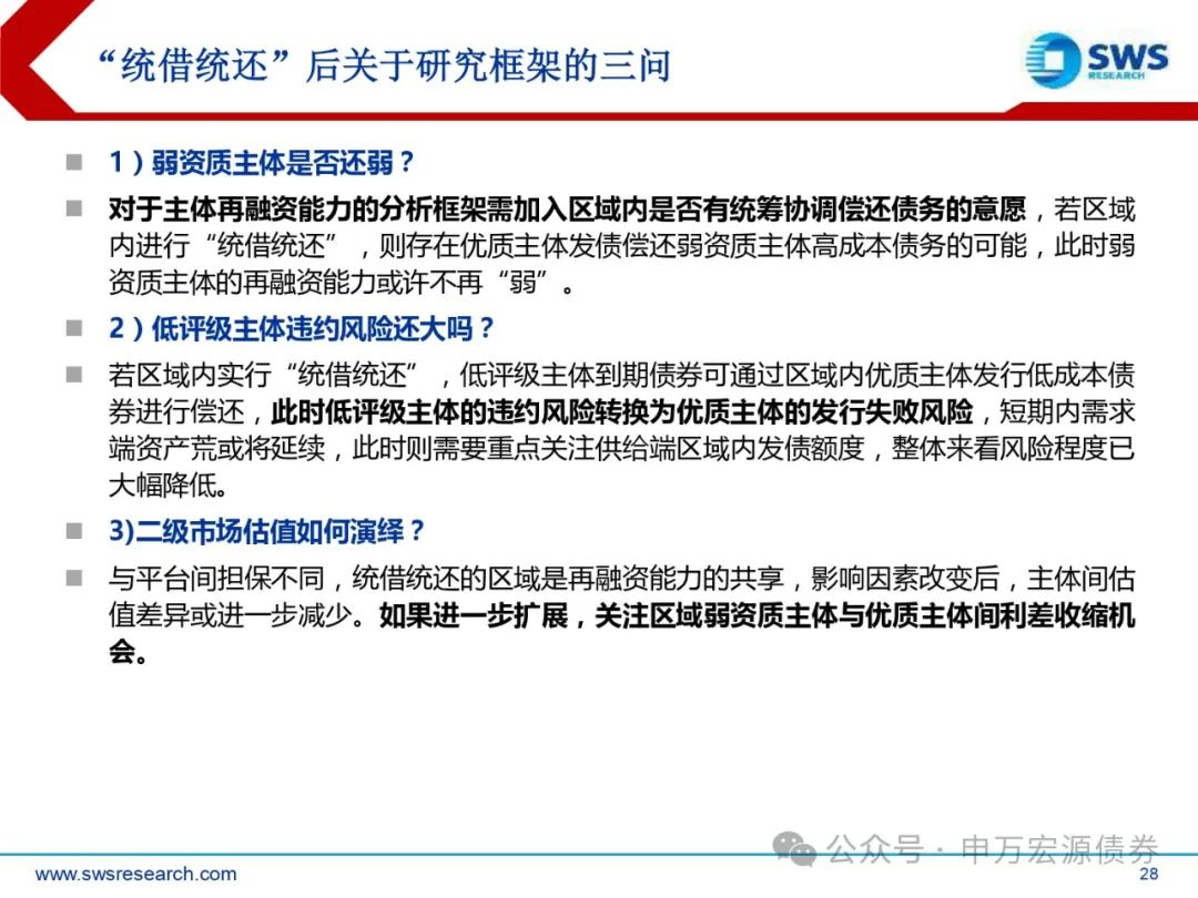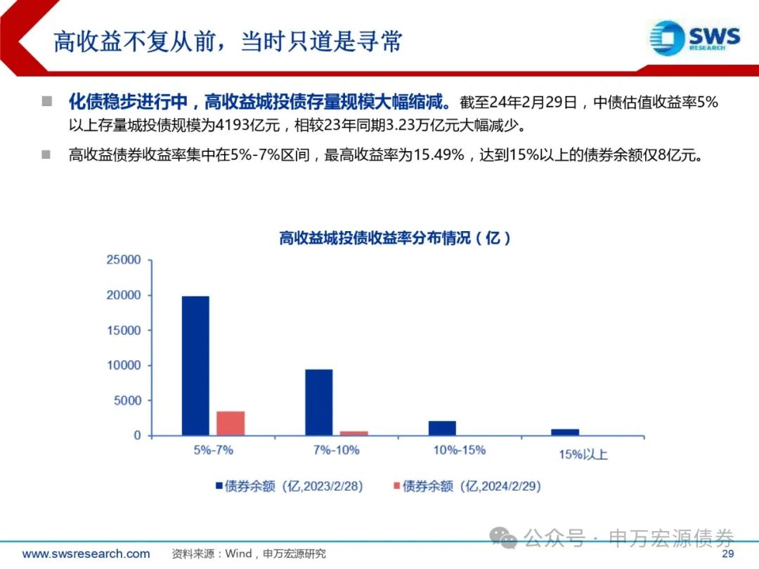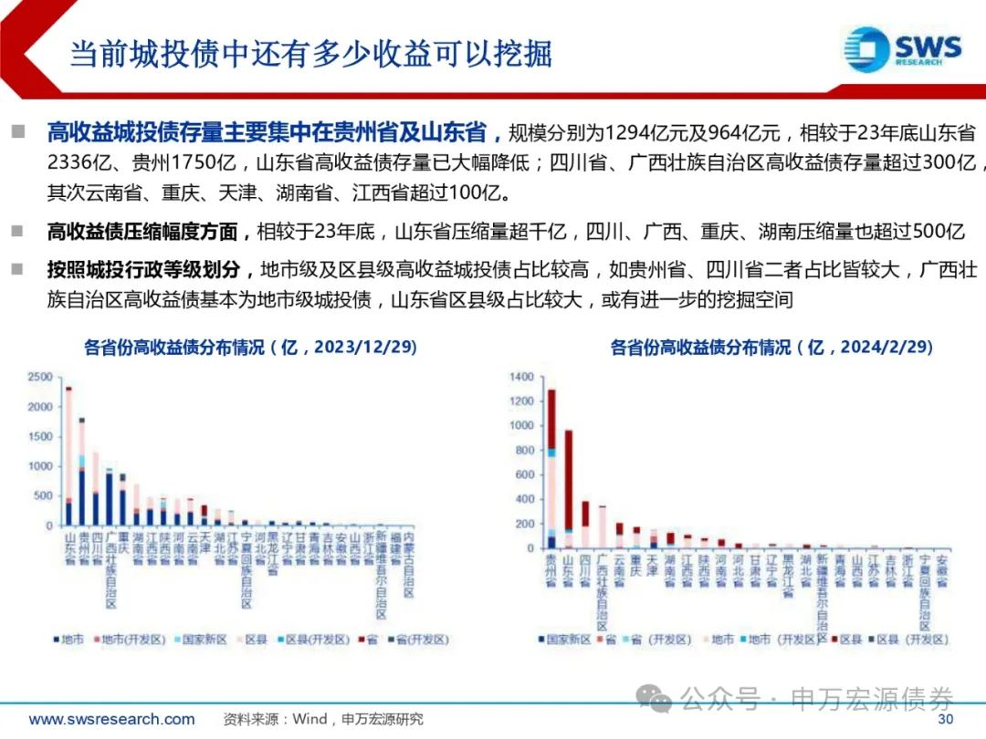高收益不复从前,当时只道是寻常。化债稳步进行中,高收益城投债存量规模大幅缩减。截至24年2月29日,中债估值收益率5%以上存量城投债规模为4193亿元,相较23年同期3.23万亿元大幅减少。高收益债券收益率集中在5%-7%区间,最高收益率为15.49%,达到15%以上的债券余额仅8亿元。分区域来看,高收益城投债存量主要集中在贵州省及山东省,规模分别为1294亿元及964亿元,相较于23年底山东省2336亿、贵州1750亿,山东省高收益债存量已大幅降低;四川省、广西壮族自治区高收益债存量超过300亿,其次云南省、重庆、天津、湖南省、江西省超过100亿。来者犹可追,从三条思路继续挖掘城投债投资机会:1)“统借统还”区域弱资质主体与优质主体间利差收缩机会;2)东部经济较发达区域中债务压力较大重点城市的化债空间;3)城投离岸人民币债券的收益挖掘机会。