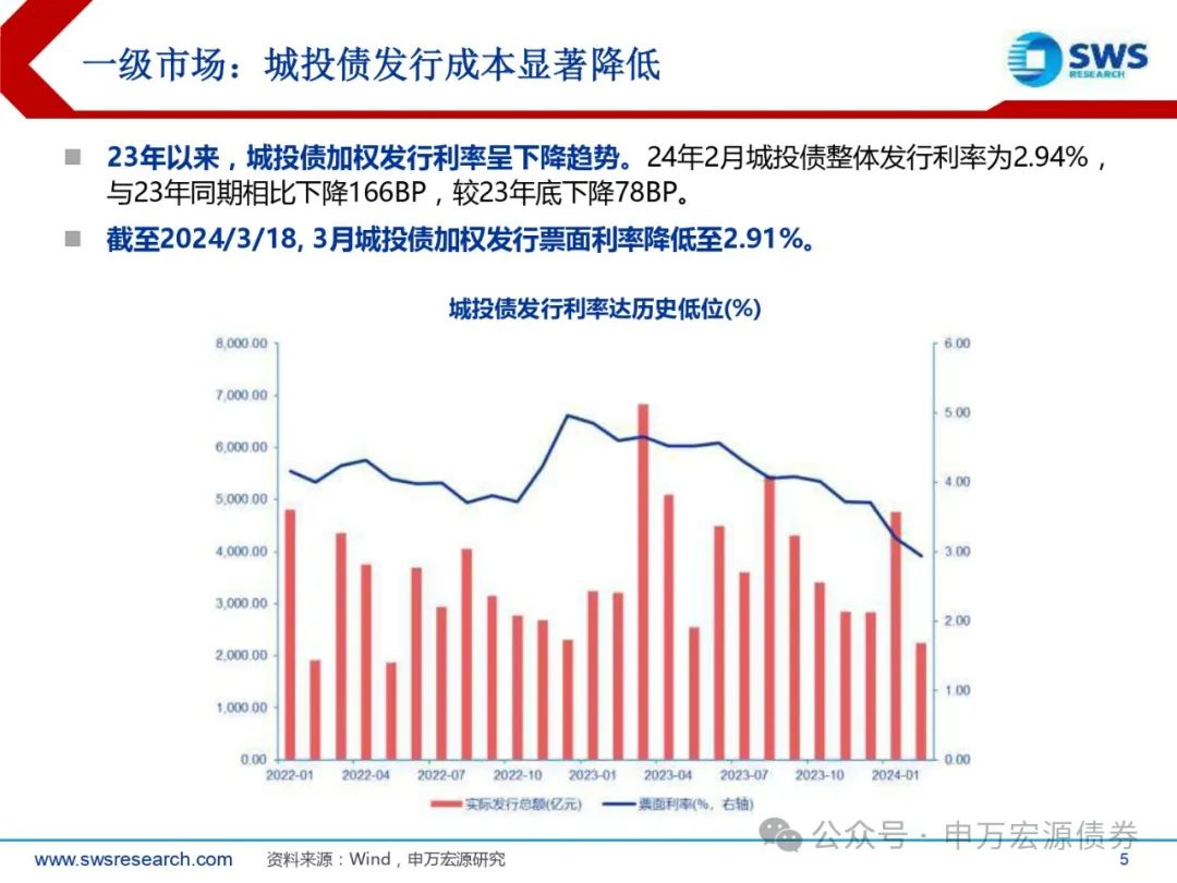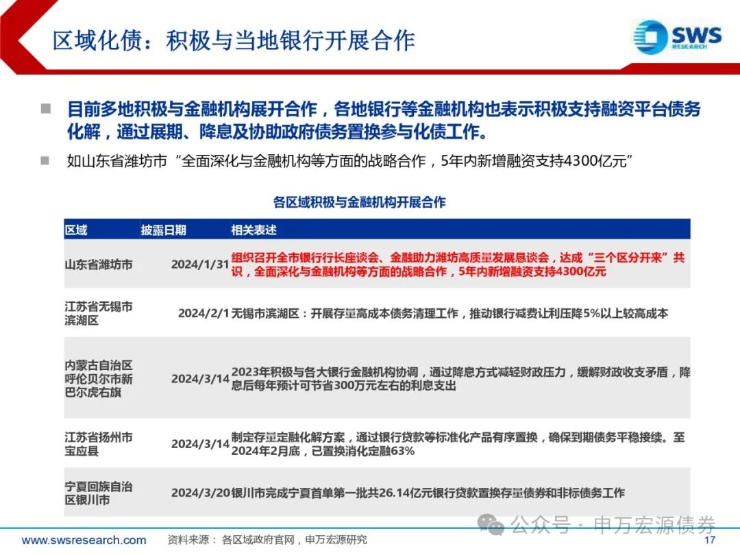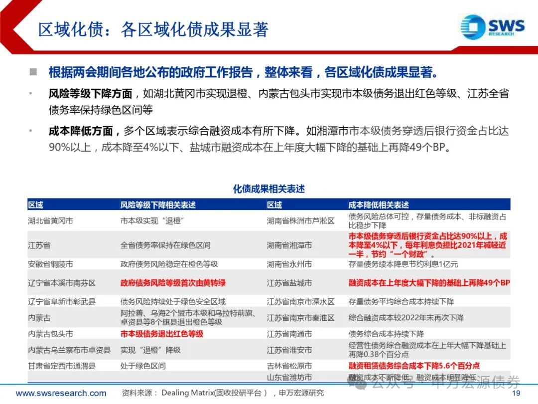 化债政策目前已取得积极效果。发行特殊再融资债进行存量债务置换工作已经落地。截至3月15日,全国已有29地公告发行特殊再融资债,发行特殊再融资债券总额为14627.12亿元;各区域中,在本轮化债中,多个地区积极争取获得隐性债务化解试点地区。整体来看,各区域化债成果显著。1)风险等级下降方面,如湖北黄冈市实现退橙、内蒙古包头市实现市本级债务退出红色等级、江苏全省债务率保持绿色区间等;2)成本降低方面,多个区域表示综合融资成本有所下降。如湘潭市市本级债务穿透后银行资金占比达90%以上,成本降至4%以下、盐城市融资成本在上年度大幅下降的基础上再降49个BP。后续特殊再融资债仍有空间。2023年全国地方政府债务限额为421674.3亿元,截至2023年12月末,全国地方政府债务余额407373亿元, 24年特殊再融资债空间仍有1.43万亿。此外,继续关注金融化债的相关政策推进。