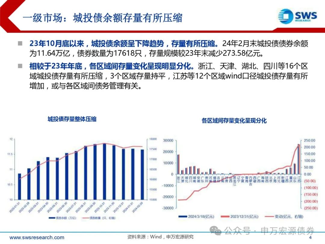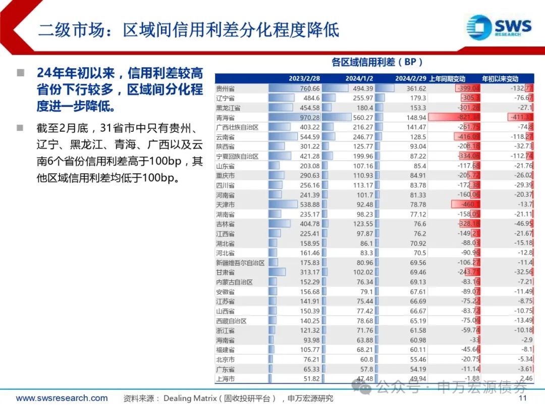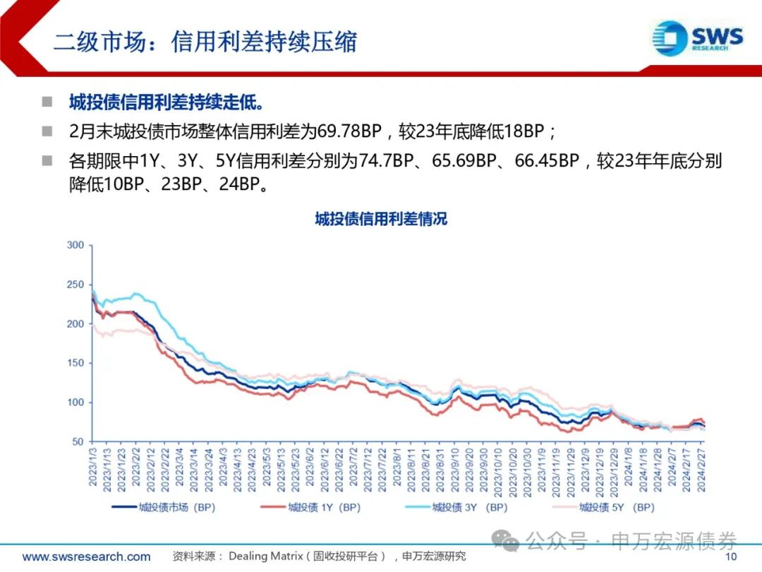 24年年初以来,化债背景下城投行情演绎迅速:1)城投债债券市场存量收缩,24年2月末城投债债券余额为11.64万亿,债券数量为17618只,存量规模较23年末减少273.58亿元。相较于23年年底,各区域间存量变化呈现明显分化。浙江、天津、湖北、四川等16个区域城投债存量有所压缩,3个区域存量持平,江苏等12个区域wind口径城投债存量有所增加,或与各区域间债务管理有关。2)城投债信用利差持续走低。2月末城投债市场整体信用利差为69.78BP,较23年底降低18BP;各期限中1Y、3Y、5Y信用利差分别为74.7BP、65.69BP、66.45BP,较23年年底分别降低10BP、23BP、24BP。3)信用利差较高省份下行较多,区域间分化程度进一步降低。截至2月底,31省市中只有贵州、辽宁、黑龙江、青海、广西以及云南6个省份信用利差高于100bp,其他区域信用利差均低于100bp。