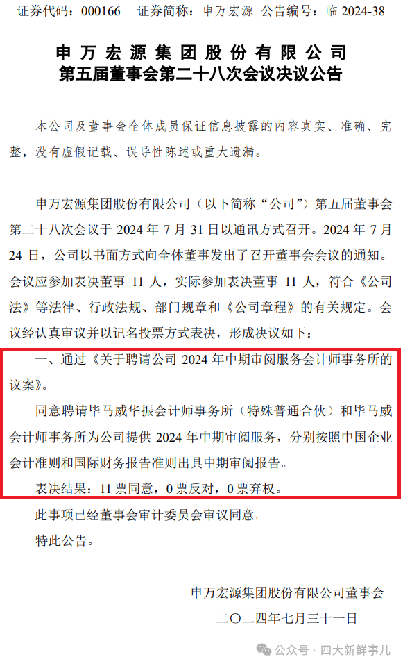 深交所主板上市公司申万宏源(000166.SZ)2024年8月1日发布的《第五届董事会第二十八次会议决议公告》显示,公司董事会同意聘请毕马威华振会计师事务所(特殊普通合伙)和毕马威会计师事务所为公司提供2024年中期审阅服务,分别按照中国企业会计准则和国际财务报告准则出具中期审阅报告。
