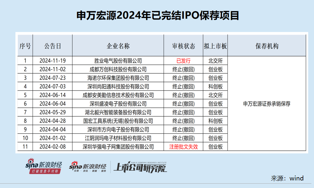 申万宏源2024年仅成功保荐1家项目上市,而终止的IPO项目数量高达9家,已完结IPO项目数量合计10家。