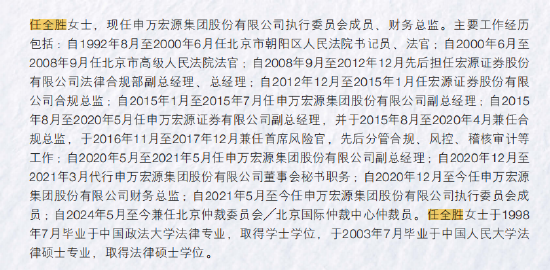 任全胜女士,现任申万宏源执行委员会成员、财务总监。主要工作经历包括:自1992年8月至2000年6月任北京市朝阳区人民法院书记员、法官;自2000年6月至2008年9月任北京市高级人民法院法官;自2008年9月至2012年12月先后担任宏源证券法律合规部副总经理、总经理;自2012年12月至2015年1月任宏源证券股份有限公司合规总监;自2015年1月至2015年7月任申万宏源集团股份有限公司副总经理;自2015年8月至2020年5月任申万宏源证券有限公司副总经理,并于2015年8月至2020年4月兼任合规总监,于2016年11月至2017年12月兼任首席风险官,先后分管合规、风控、稽核审计等工作;自2020年5月至2021年5月任申万宏源集团股份有限公司副总经理;自2020年12月至2021年3月代行申万宏源集团股份有限公司董事会秘书职务;自2020年12月至今任申万宏源集团股份有限公司财务总监;自2021年5月至今任申万宏源集团股份有限公司执行委员会成员;自2024年5月至今兼任北京仲裁委员会/北京国际仲裁中心仲裁员。任全胜女士于1998年7月毕业于中国政法大学法律专业,取得学士学位,于2003年7月毕业于中国人民大学法律硕士专业,取得法律硕士学位。