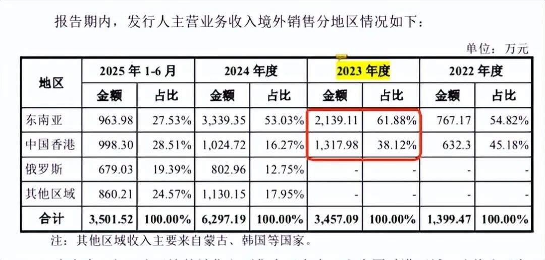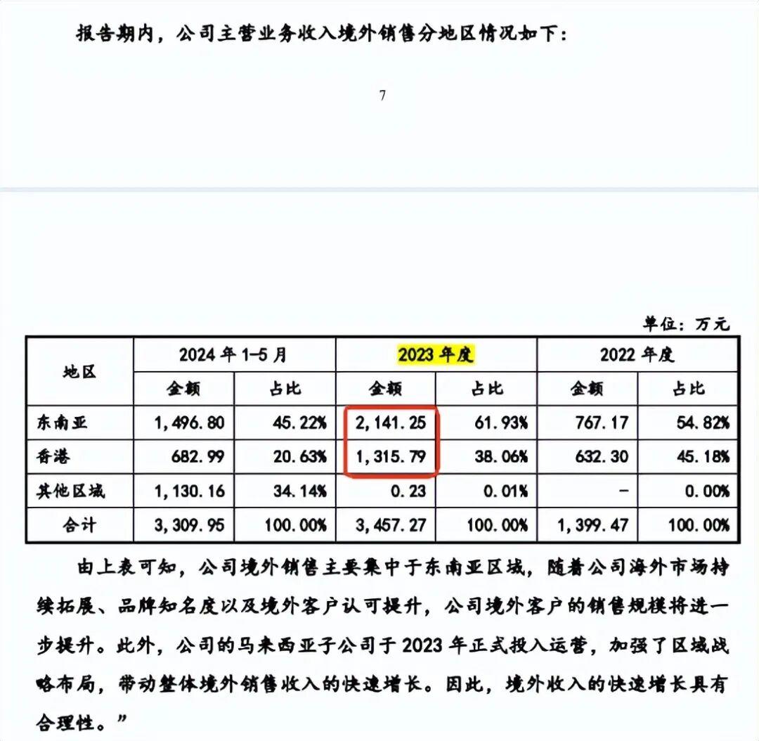 根据唐兴科技新三板申报材料,2023年唐兴科技主营业务收入中的境外销售金额为3,457.27万元,其中东南亚地区为2,141.25万元,中国香港为1,315.79万元,其他地区为0.23万元。