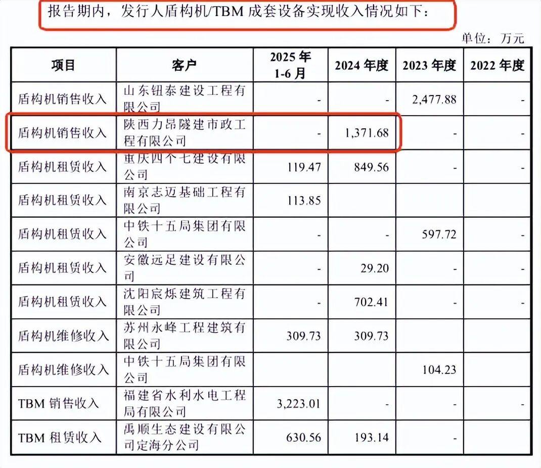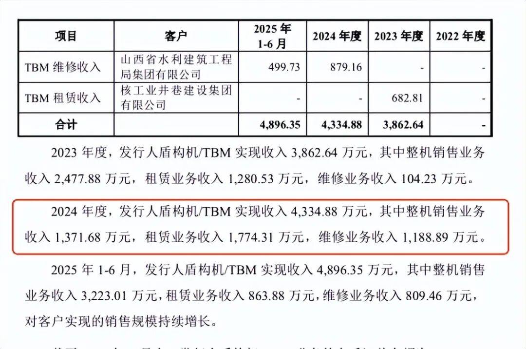 一轮问询回复(55-58页)“客户开拓情况”信披显示,2024年公司向陕西力昂隧建市政工程有限公司销售盾构机形成收入1,371.68万元,且该年度并未向其他客户销售盾构机或TBM设备。这与69页披露的2024年公司销售外开挖成套装备盾构机及TBM的金额不符(相差了88.50万元),两处披露的2023年和2025年上半年数据则相同。