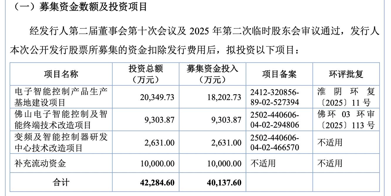 本次IPO,尚研科技拟募资4.01亿元,用于电子智能控制产品生产基地建设项目、佛山电子智能控制及智能终端技术改造项目、变频及智能控制器研发中心技术改造项目及补充流动资金。