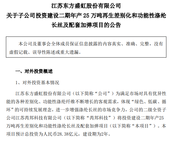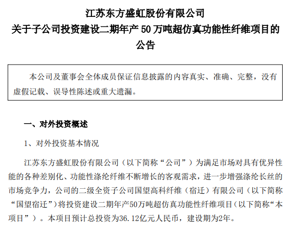 今日(1月13日),东方盛红发布2则公告,称旗下两家子公司拟合计斥资64.5亿元扩产两大项目——超仿真功能性纤维及再生差别化和功能性涤纶长丝,若两大项目达产,预计可合计贡献年利润总额14.66亿元。具体来看如下: