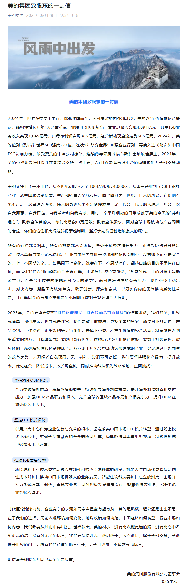 美的集团发布致股东的一封信,表示2025年,美的要坚定落实“以简化促增长,以自我颠覆直面挑战”的经营思路。要敢于做减法,寻找简单的答案,通过对业务结构、产品类别、工作模式、组织架构等进行简化,去掉不必要、不产生价值的经营活动,将资源投入到更重要的地方。自我颠覆就是要跳出既有优势,摆脱历史负担和路径依赖,要敢于打破结构,破坏体制,减少结构性和体制性成本。