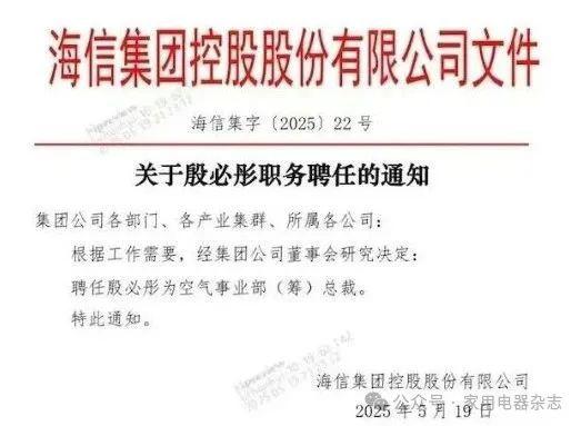 ZAKER 科技消息,5 月 19 日,海信集团控股股份有限公司发布职务聘任通知,殷必彤正式加盟海信,出任空气事业部(筹)总裁。