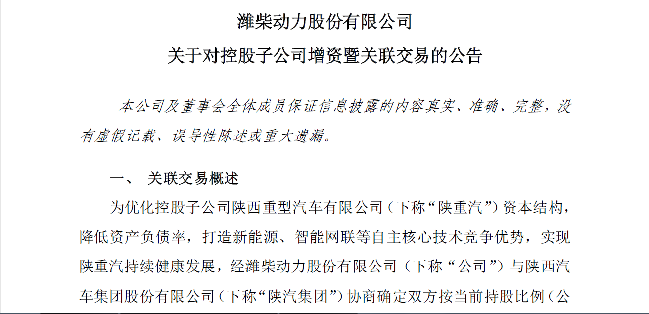 9月29日,潍柴动力(000338.SZ)发布公告称,公司与陕西汽车集团股份有限公司(以下简称陕汽集团)协商确定双方按当前持股比例分别对陕西重型汽车有限公司(以下简称陕重汽)增资不超过40.8亿元和39.2亿元,增资款项分期到位,其中首期分别增资10.2亿元和9.8亿元。