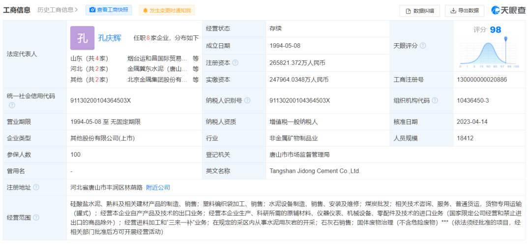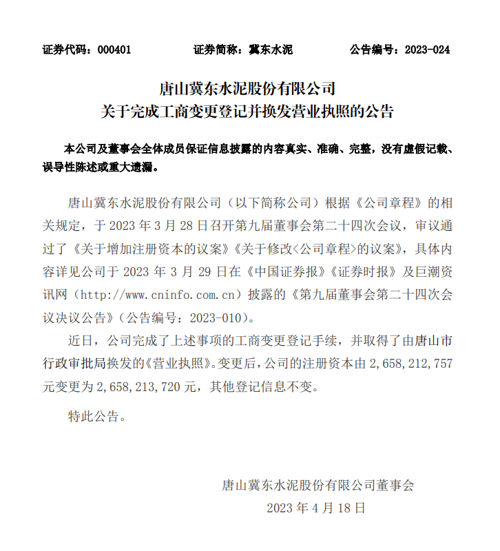 水泥人网注意到,冀东水泥注册资本变更和章程修正案备案均发生在2023年4月14日。