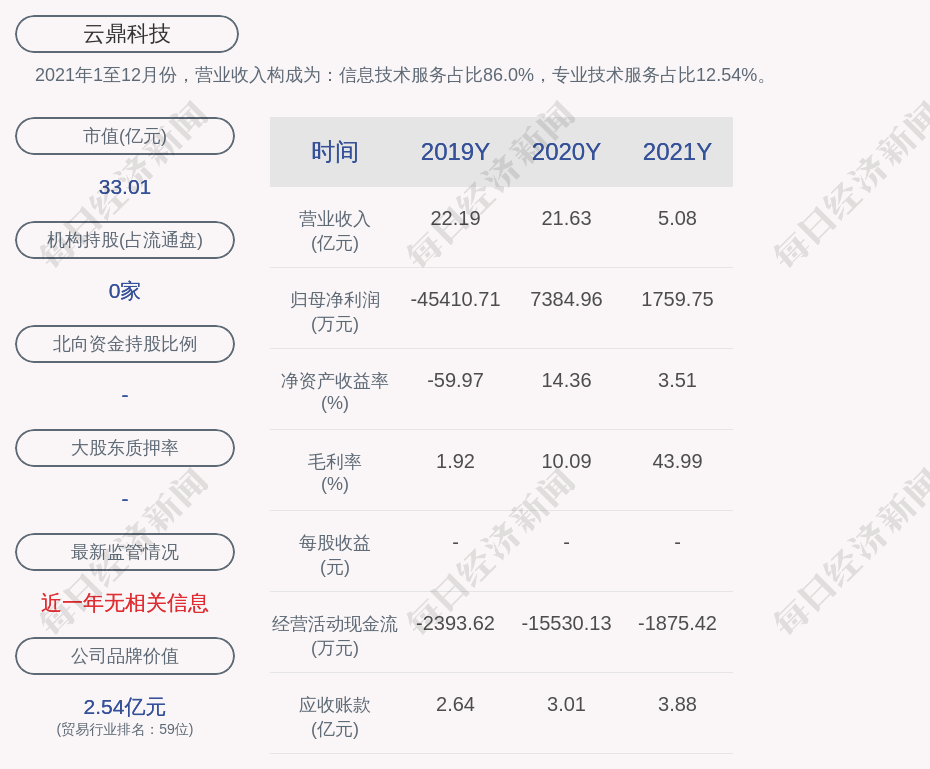 2021年1至12月份,云鼎科技的营业收入构成为:信息技术服务占比86.0%,专业技术服务占比12.54%。